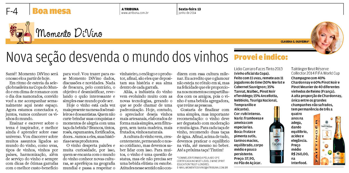 Estreia - Momento DiVino minha nova coluna no Jornal A Tribuna Santos/SP - 13/06/2014