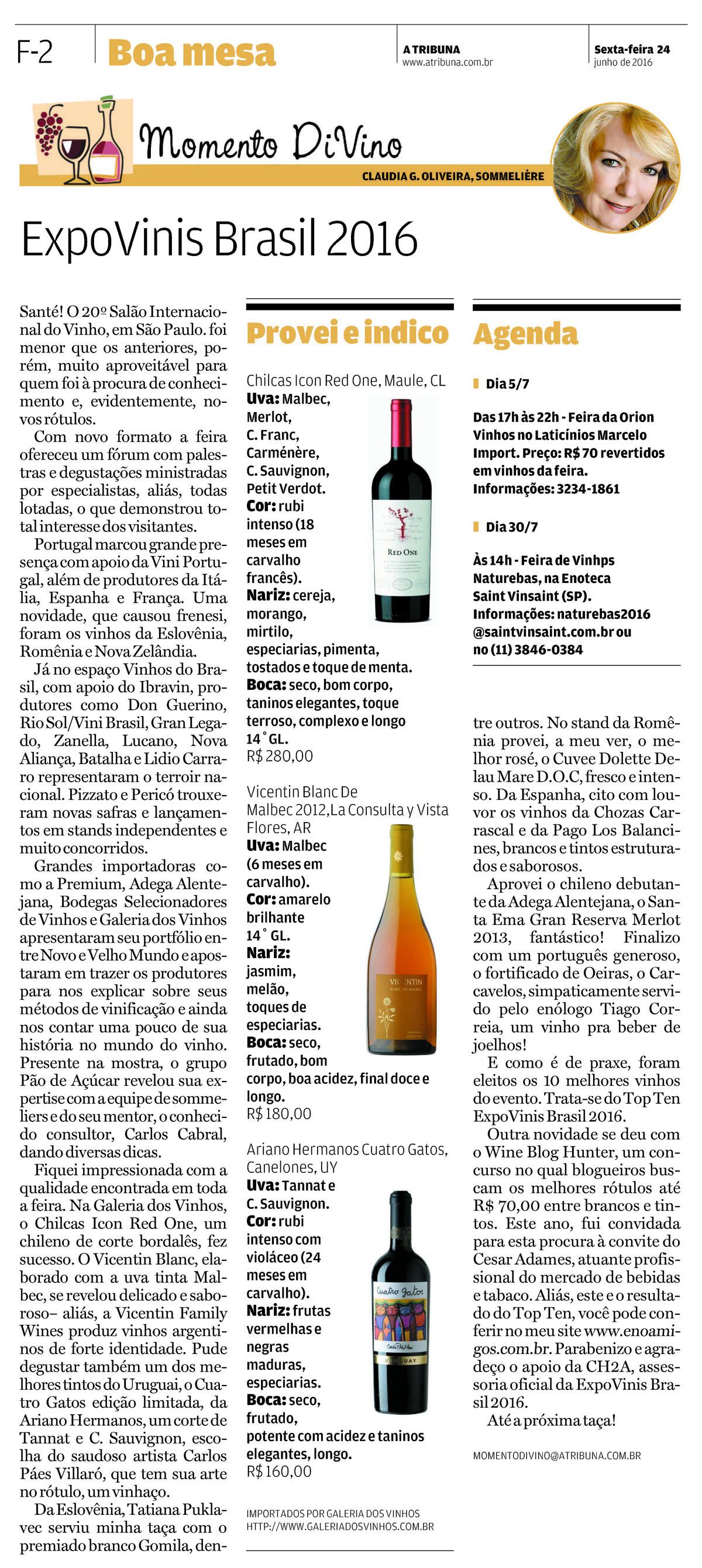 Outra novidade se deu com o Wine Blog Hunter, um concurso no qual blogueiros buscam os melhores rótulos até R$ 70,00 entre brancos e tintos. Este ano, fui convidada para esta procura à convite do Cesar Adames, atuante profissional do mercado de bebidas e tabaco. Aliás, este e o resultado do Top Ten, você pode conferir no meu site www.enoamigos.com.br . Parabenizo e agradeço o apoio da CH2A, assessoria oficial da Expo Vinis Brasil 2016.