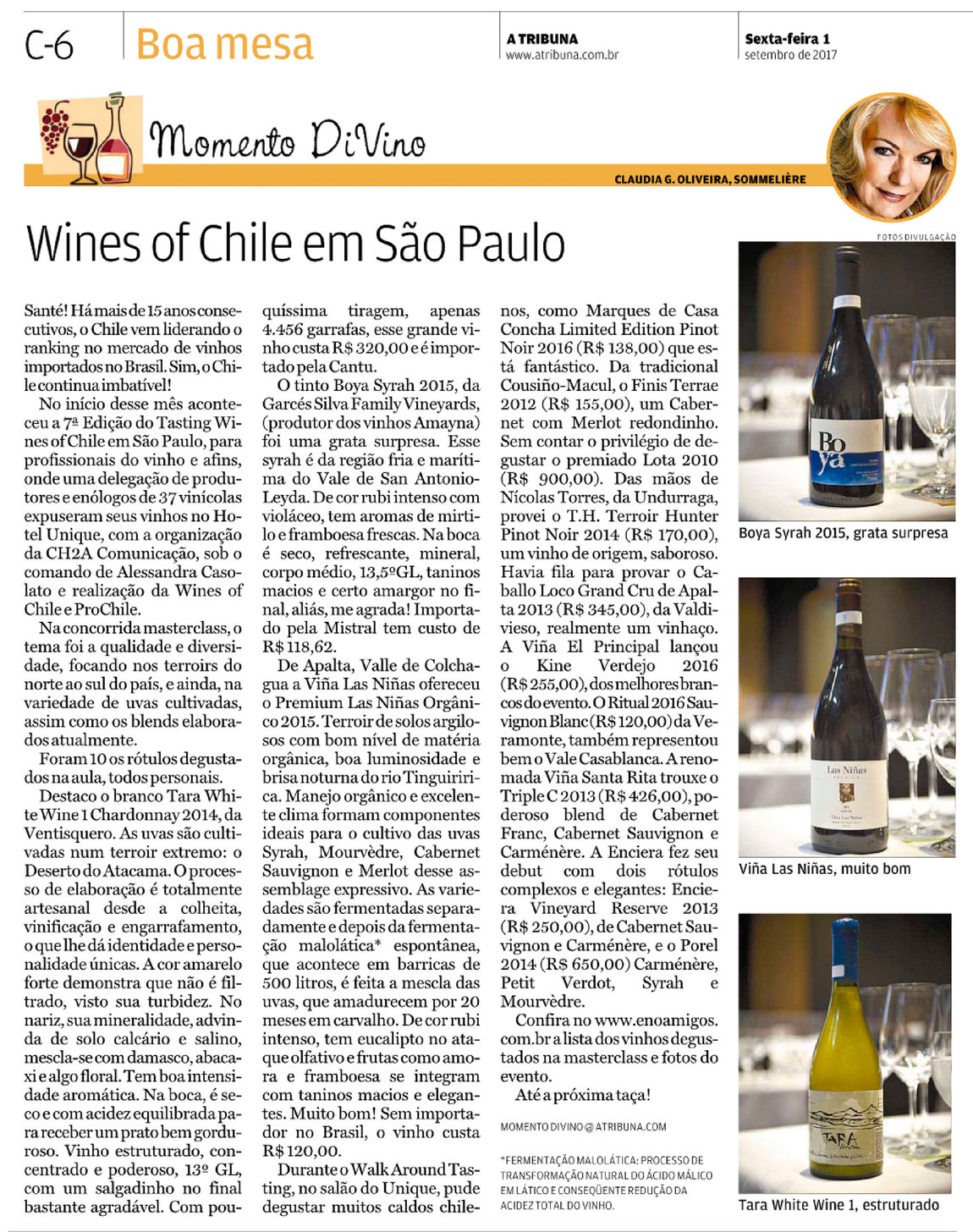 Destaco o branco Tara White Wine 1 Chardonnay 2014, da Ventisquero. As uvas são cultivadas num terroir extremo: o Deserto do Atacama. O processo de elaboração é totalmente artesanal desde a colheita, vinificação e engarrafamento, o que lhe dá identidade e personalidade únicas. A cor amarelo forte demonstra que não é filtrado, visto sua turbidez. No nariz, sua mineralidade, advinda de solo calcário e salino, mescla-se com damasco, abacaxi e algo floral. Tem boa intensidade aromática. Na boca, é seco e com acidez equilibrada para receber um prato bem gorduroso. Vinho estruturado, concentrado e poderoso, 13º GL, com um salgadinho no final bastante agradável. Com pouquíssima tiragem, apenas 4.456 garrafas, esse grande vinho custa R$320,00 e é importado pela Cantu.