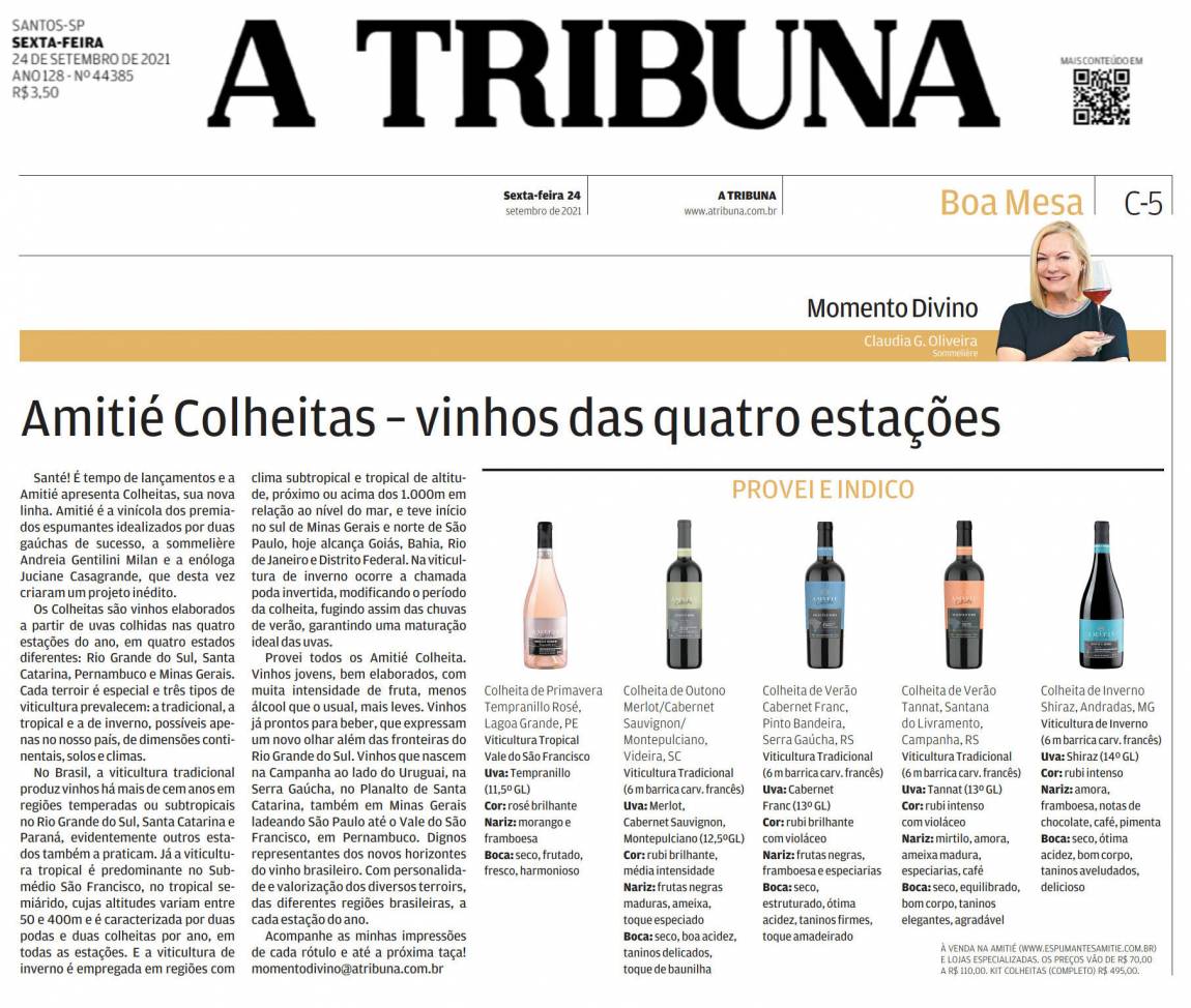 Santé! É tempo de lançamentos e a Amitié apresenta Colheitas, sua nova linha. Amitié é a vinícola dos premiados espumantes idealizados por duas gaúchas de sucesso, a sommelière Andreia Gentilini Milan e a enóloga Juciane Casagrande, que desta vez criaram um projeto inédito.