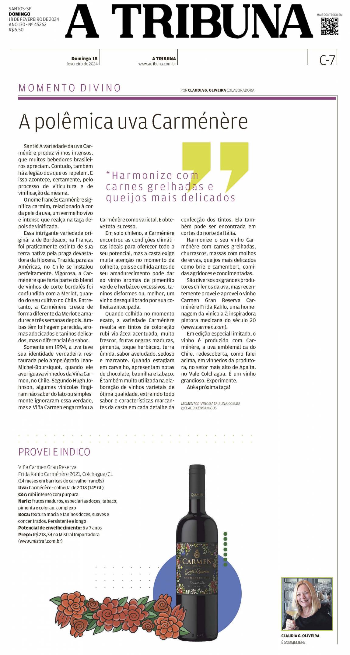 São diversos os grandes produtores chilenos da uva, mas recentemente provei e aprovei o vinho Carmen Gran Reserva Carménère Frida Kahlo, uma homenagem da vinícola à inspiradora pintora mexicana do século 20. www.carmen.com