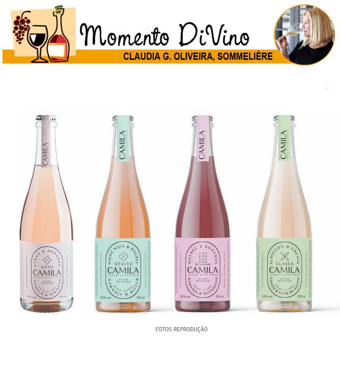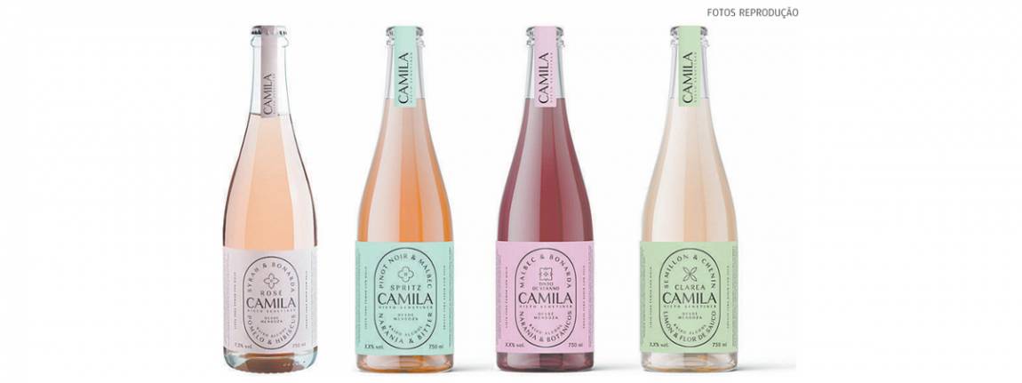 Há também o Camila Rosé, com vinho rosé de Syrah e Bonarda com extratos de toranja ou grapefruit, hibisco e limão. Indicação: sirva com gelo, acompanhado de uma fatia de toranja e frutas vermelhas. Ou ainda com folhas de hortelã fresca, para destacar os aromas florais.