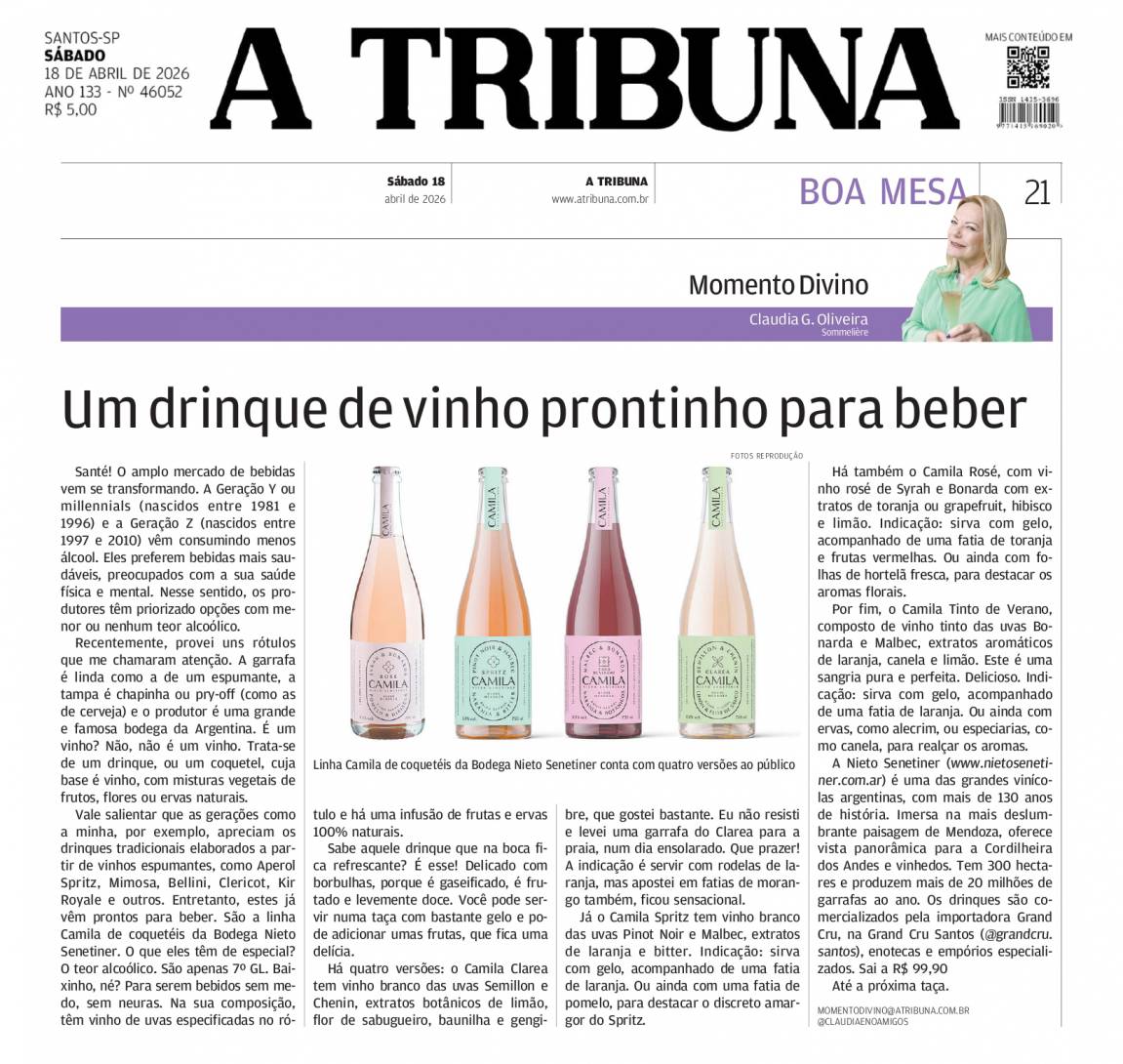 Vale salientar que as gerações como a minha, por exemplo, apreciam os drinques tradicionais elaborados a partir de vinhos espumantes, como Aperol Spritz, Mimosa, Bellini, Clericot, Kir Royale e outros. Entretanto, estes já vêm prontos para beber. São a linha Camila de coquetéis da Bodega Nieto Senetiner. O que eles têm de especial? O teor alcoólico. São apenas 7º GL. Baixinho, né? Para serem bebidos sem medo, sem neuras. Na sua composição, têm vinho de uvas especificadas no rótulo e há uma infusão de frutas e ervas 100% naturais.