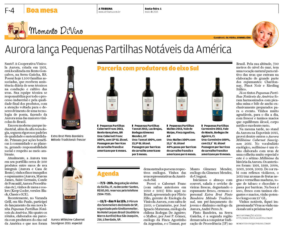 Momento DiVino "Aurora lança Pequenas Partilhas Notáveis da América" 01/05/15 - A Tribuna Jornal - Santos/SP