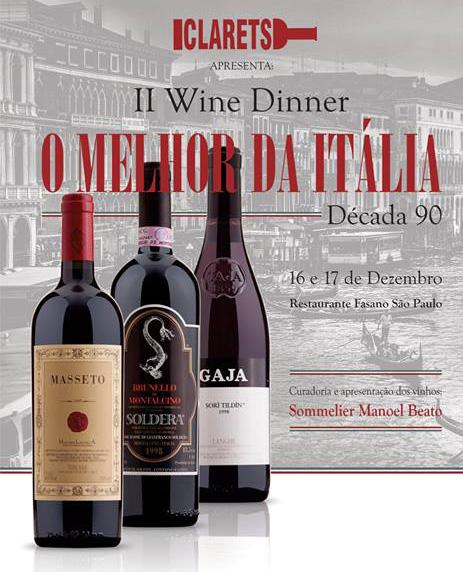 Imagine um jantar com os melhores pratos da cozinha italiana harmonizados com os 12 melhores e mais consagrados vinhos da Itália! E mais: com vinhos provenientes das mesmas regiões dos pratos! Pois esse jantar acontecerá nos dias 16 e 17 de dezembro, em São Paulo, em mais uma parceria entre o Hotel Fasano e a importadora de vinhos Clarets.