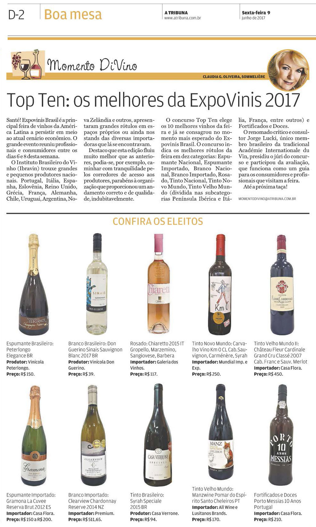 O concurso Top Ten elege os 10 melhores vinhos da feira e já se consagrou no momento mais esperado do ExpoVinis Brasil. O concurso indica os melhores rótulos da feira em dez categorias: Espumante Nacional, Espumante Importado, Branco Nacional, Branco Importado, Rosado, Tinto Nacional, Tinto Novo Mundo, Tinto Velho Mundo (dividida nas subcategorias ‘Península Ibérica’ e ‘Itália, França, entre outros’) e Fortificados e Doces.