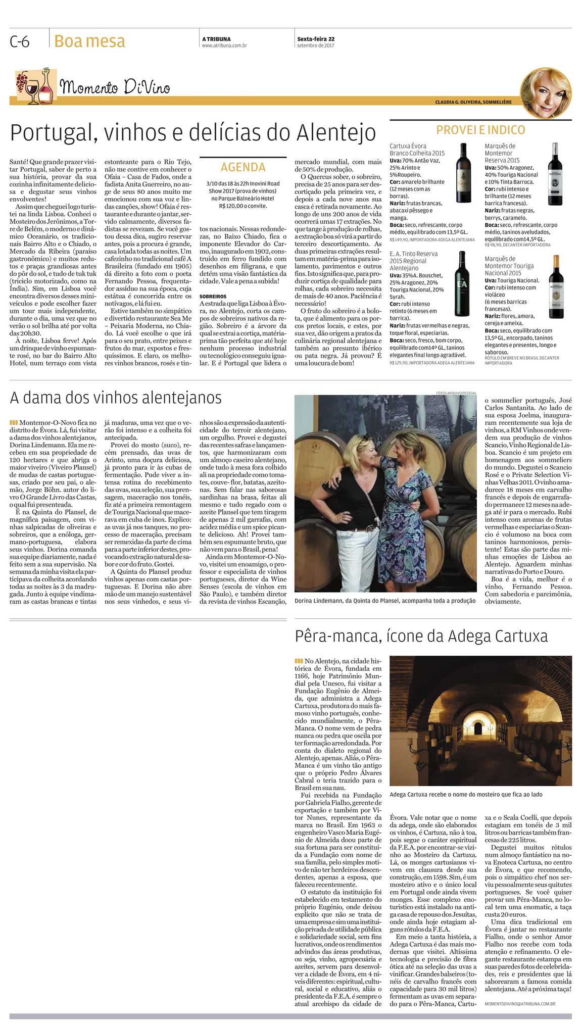 Montemor-O-Novo fica no distrito de Évora, em 30 minutos de estrada lá fui eu visitar a Dama dos Vinhos Alentejanos, Dorina Lindemann (tema desta coluna em 13/03/2015 - Ver Artigo "A Dama dos Vinhos do Ajentejo"). Ela me recebeu em sua propriedade de 120 hectares e que abriga o maior viveiro (Viveiro Plansel) de mudas de castas portuguesas, criado por seu pai, o alemão, Jorge Böhn. Autor do livro: O Grande Livro das Castas, o qual fui presenteada, e fiquei lisonjeada!