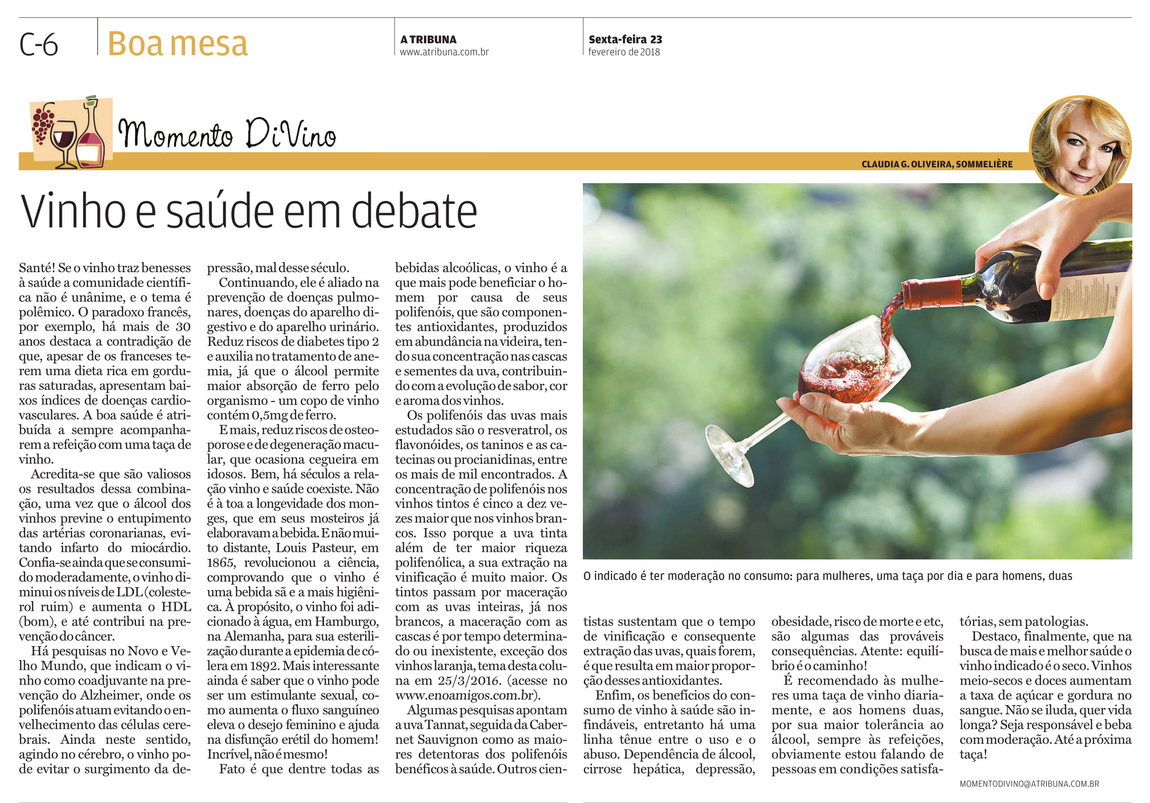 Bem, há séculos a relação vinho e saúde coexiste. Não é à toa a longevidade dos monges, que em seus mosteiros já elaboravam a bebida. E não muito distante, Louis Pasteur, em 1865, revolucionou a ciência, comprovando que o vinho é uma bebida sã e a mais higiênica. À propósito, o vinho foi adicionado à água, em Hamburgo, na Alemanha, para sua esterilização durante a epidemia de cólera em 1892. Mais interessante ainda é saber que o vinho pode ser um estimulante sexual, como aumenta o fluxo sanguíneo eleva o desejo feminino e ajuda na disfunção erétil do homem! Incrível, não é mesmo!