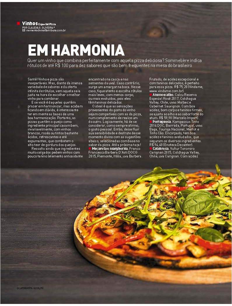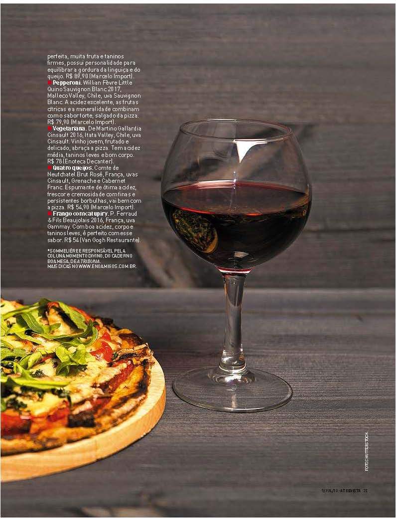 O ideal é que as sensações provenientes do gosto do vinho compatibilizem-se com as da pizza, num complemento de realce um do outro. Logicamente, há de se ter em consideração, como sempre afirmo, o seu gosto pessoal, deixe fluir sua sensibilidade e desfrute desse momento divino. Até a próxima taça!