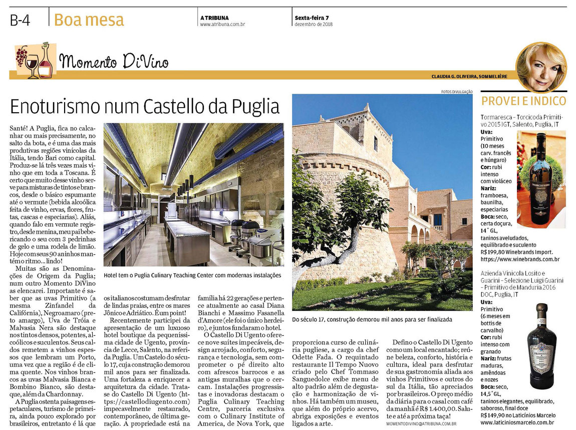 Defino o Castello Di Ugento como um local encantado; reúne beleza, conforto, história e cultura, ideal para desfrutar de sua gastronomia aliada aos vinhos Primitivos e outros do sul da Itália, tão apreciados por brasileiros. Salute e até a próxima taça!