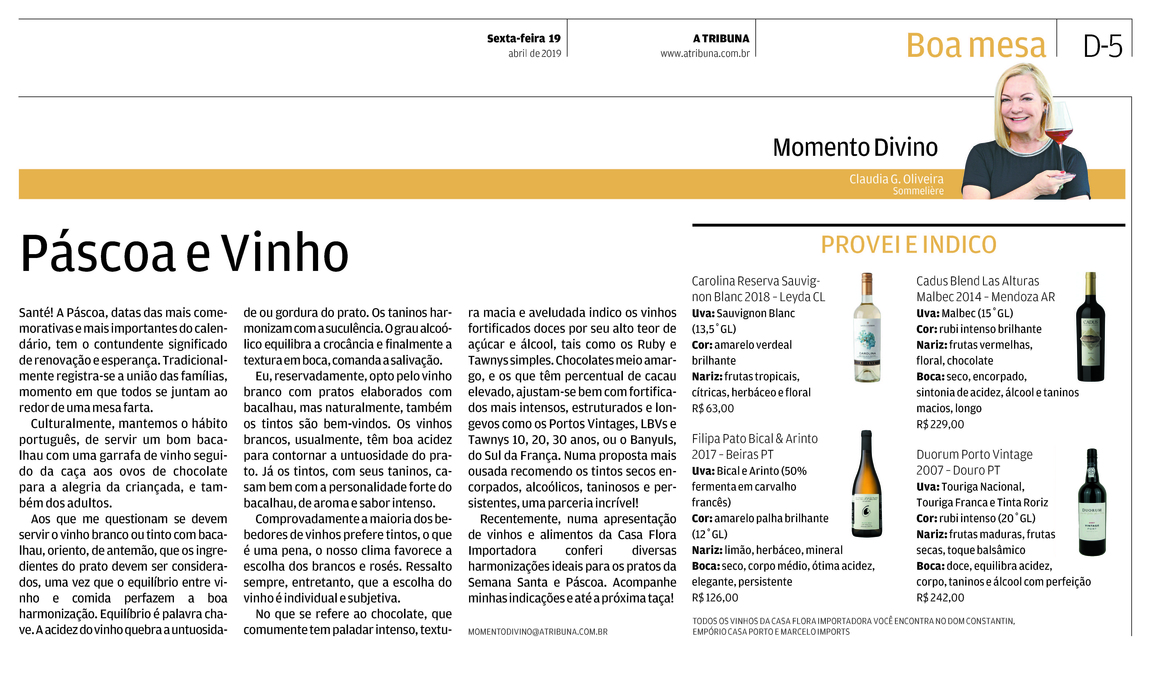 Recentemente, numa apresentação de vinhos e alimentos da Casa Flora Importadora conferi diversas harmonizações ideais para os pratos da Semana Santa e Páscoa. Acompanhe minhas indicações e até a próxima taça!