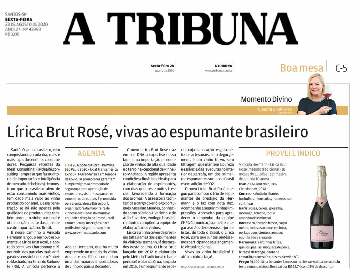 E nesse caminho a Vinícola Hermann lançou o seu novo espumante: o Lírica Brut Rosé, elaborado com uvas Chardonnay e Pinot Noir, das parcelas mais antigas dos seus vinhedos em Pinheiro Machado, na Serra do Sudoeste (RS). A vinícola pertence a Adolar Hermann, que há muito empreende no mundo do vinho. Adolar e os filhos comandam uma das maiores importadoras de vinho do país: a Decanter.