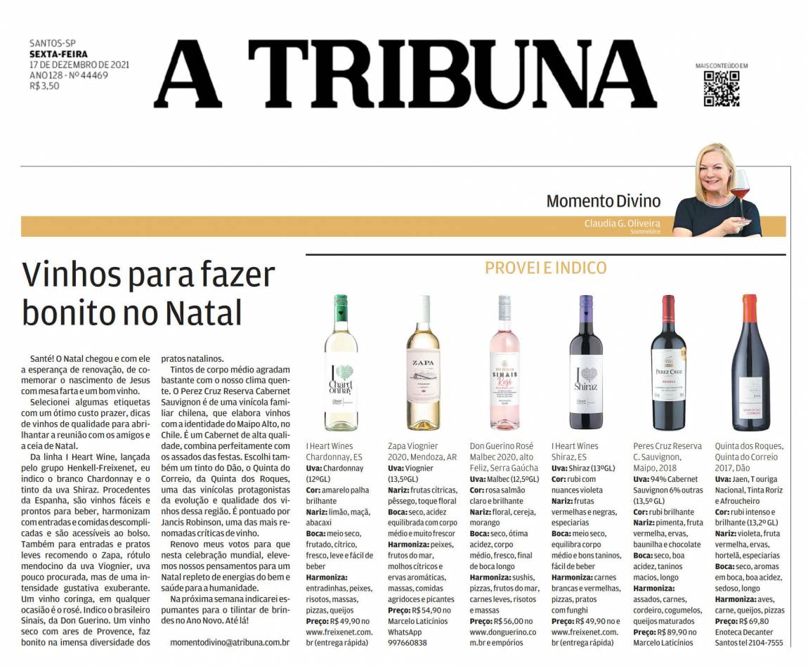 Da linha I Heart Wine, lançada pelo grupo Henkell-Freixenet, eu indico o branco Chardonnay e o tinto da uva Shiraz. Procedentes da Espanha, são vinhos fáceis e prontos para beber, harmonizam com entradas e comidas descomplicadas e são acessíveis ao bolso. Também para entradas e pratos leves recomendo o Zapa, rótulo mendocino da uva Viognier, uva pouco procurada, mas de uma intensidade gustativa exuberante. Um vinho coringa, em qualquer ocasião é o rosé. Indico o brasileiro Sinais, da Don Guerino. Um vinho seco com ares de Provence, faz bonito na imensa diversidade dos pratos natalinos.