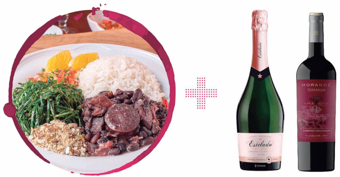 Convido você a provar a feijoada com um vinho tinto de meio-corpo a encorpado, estruturado, com boa acidez para equilibrar a gordura, taninos presentes ajustando a suculência das carnes, mas que sejam aveludados para não se debaterem com o sal. Os das uvas Cabernet Sauvignon, Tannat, Malbec, Shiraz, Tempranillo, Touriga Nacional, Grenache e Merlot, passados em madeira, casam bem. Evite tintos leves, pois não se ajustam à exuberância do prato. Os espumantes surpreendem. Eu harmonizo com os rosés. Seu frescor, o leve tanino junto ao gás carbônico com seu perlage (borbulhas) limpam as nossas papilas gustativas, proporcionando uma sensação prazerosa.