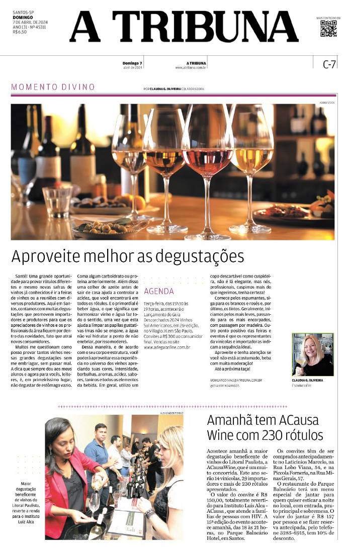 09/04 terça-feira, das 15h30 às 19hs – Lançamento do Guia Descorchados 2024 Vinhos Sul Americanos em 26ª Edição, no Villagio JK em São Paulo. Convites R$ 300 consumidor final. Vendas no site www.adegaonline.com.br