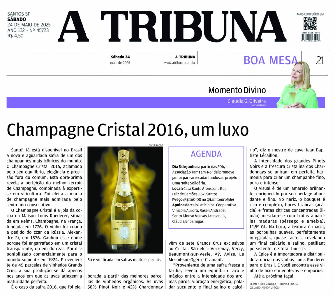 Santé! Já está disponível no Brasil a nova e aguardada safra de um dos champanhes mais icônicos do mundo. O Champagne Cristal 2016, aclamado pelo seu equilíbrio, elegância e precisão fora do comum. Esta obra-prima revela a perfeição do melhor terroir de Champagne, combinado à expertise em viticultura e a um profundo respeito pela natureza. E foi eleita a "marca de champagne mais admirada" pelo sexto ano consecutivo.