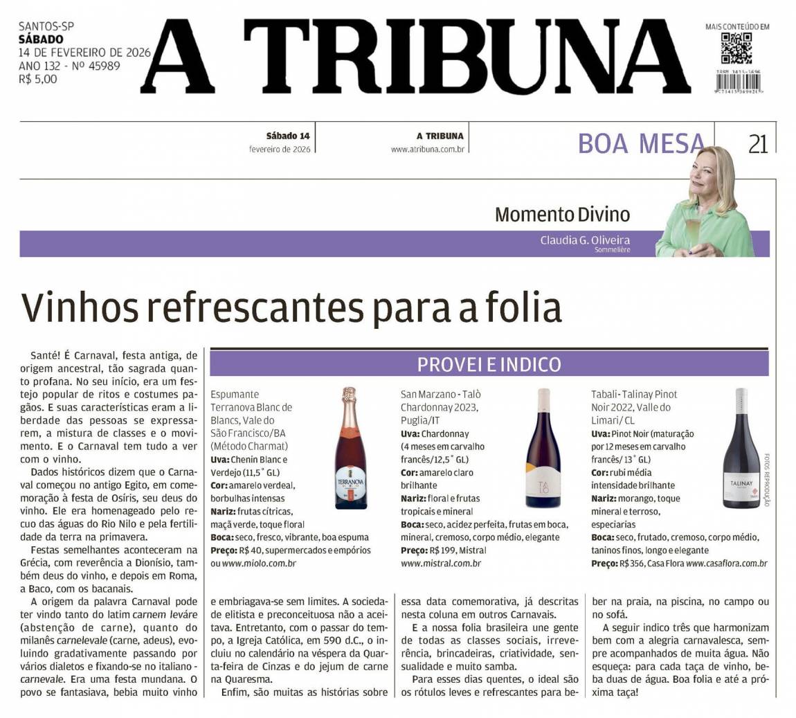A seguir indico três que harmonizam bem com a alegria carnavalesca, sempre acompanhados de muita água. Não esqueça: para cada taça de vinho, beba duas de água. Boa folia e até a próxima taça!