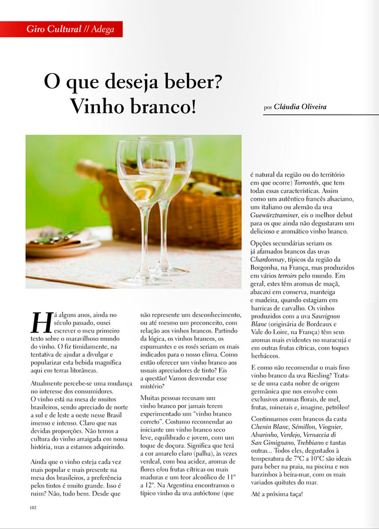 O que deseja beber? Vinho branco! • 14-10-2015 • Ano 8 - por Cláudia Oliveira • 33 / pág. 102 • São Paulo